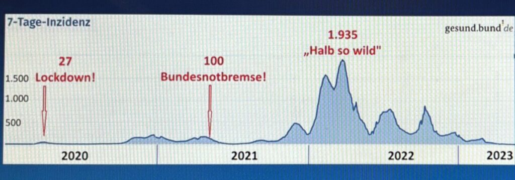 Ainda mais grave é a banalização de um grave erro metodológico que ainda hoje é citado por incautos, amadores e mal intencionados como a principal justificativa para todas as medidas tomadas. Trata-se da ideia de que o número de mortos da pandemia acompanhava a incidência da doença verificada nos testes obrigatórios naquele período. “Essa construção fantasiosa pode ser facilmente desmontada com as estatísticas do próprio governo”, critica Stefan Homburg, apresentando dois gráficos. Um com o número oficial de mortes e outro com a incidência mostrada pelos testes. A discrepância entre o que mostram os gráficos e o argumento do governo é clara.